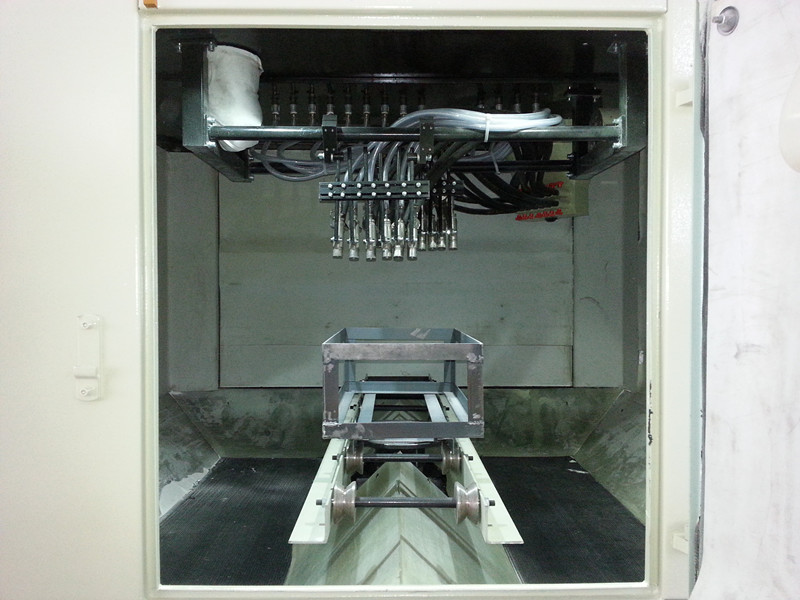 導軌旋轉(zhuǎn),工件放置于推車轉(zhuǎn)盤上,轉(zhuǎn)盤的旋轉(zhuǎn)速度視工件噴砂效果可予調(diào)節(jié)。
